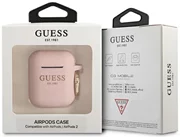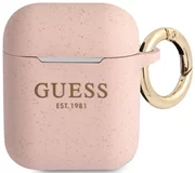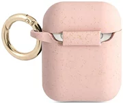 GUESS Silicone Cover. The silicone case protects Apple AirPods wireless headphone docking station from surface damage and scratches. The high quality silicone case fits perfectly into the original AirPods case and is extremely pleasant to the touch. On the side of the case there is a practical gold ring that allows you to attach the case for example to the leash. Additional visual effects adds glitter finish.