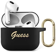 GUESS Silicone Cover. The silicone case protects Apple AirPods wireless headphone docking station from surface damage and possible loss. The high quality silicone case fits perfectly into the original AirPods 3 case and is extremely pleasant to the touch. The whole is complemented by the distinctive gold Guess logo which makes the case takes on an elegant style. On the side of the case there is a practical gold ring that allows you to attach the case for example to the leash.