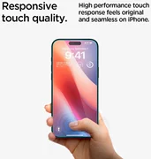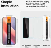 Spigenin "EZ Fit" -sarjan karkaistu lasi on kiinnitetty puhelimen etupuolelle täydellisesti leikatulla kiinnityskehyksellä, jonka ansiosta voit sijoittaa sen täydellisesti näytölle. Valmistaja on yksinkertaistanut kiinnitysmenetelmää niin paljon, että se on täysin intuitiivinen jokaiselle käyttäjälle.