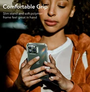 The robust metal stand provides simpler and more comfortable operation of larger smartphones when watching movies, among others.