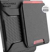 The leather card holder is made of high-quality material and can hold up to 4 cards. The wallet portion of the case is fully detachable for quick and easy wireless charging. With the modular design, the wallet can also be swapped out for other compatible accessories including a bike mount, armband and holster.