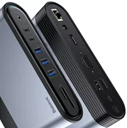 Hub Baseus has RJ45, DC 12V, 4K HDMI, 2x USB 2.0, VGA HD, 1x minijack 3,5 mm, 2x USB-C, and 3x USB 3.0, SD and micro SD memory card.